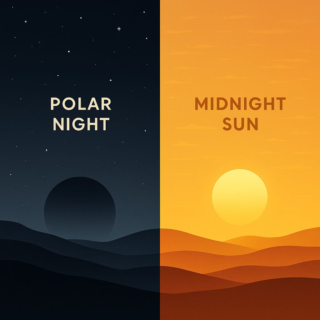 The North and South poles each get one sunrise and one sunset per year. And when the sun sets…it doesn’t rise above the horizon again for six months. And, conversely, once the sun rises, it doesn’t dip below the horizon again for another six months.